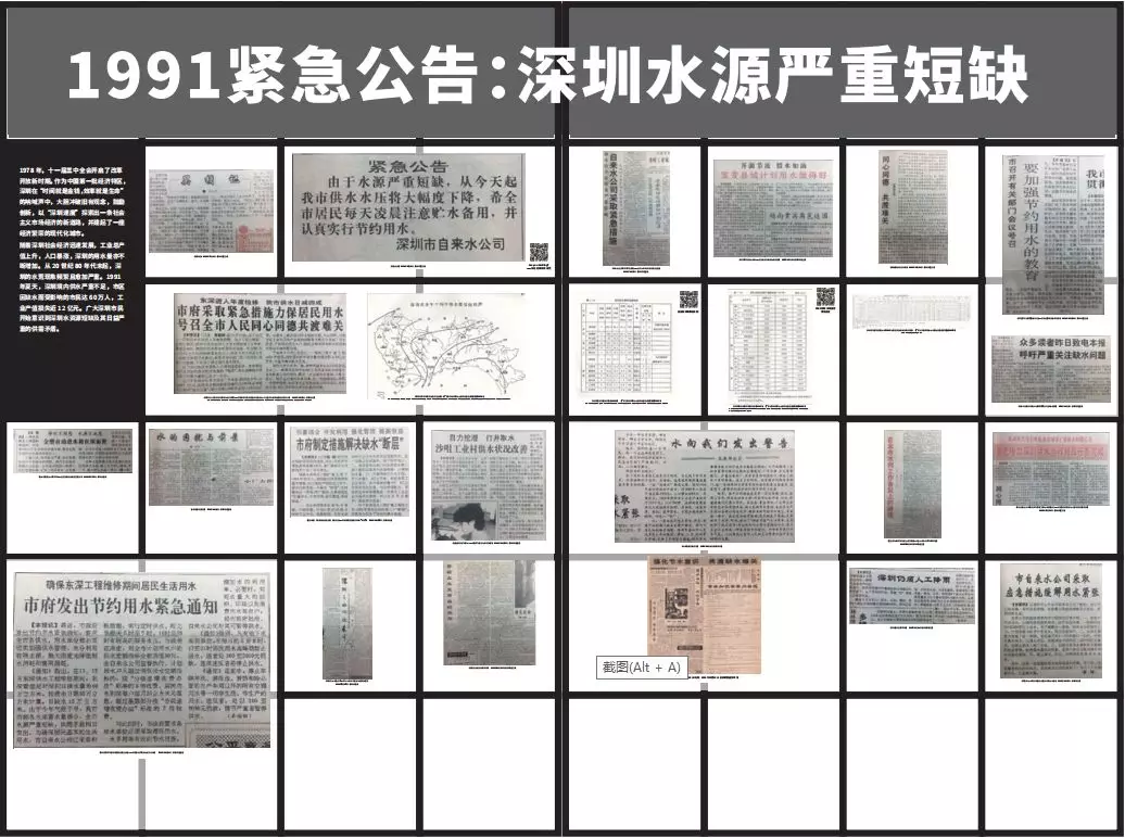 第一部分以“1991緊急公告:深圳水源嚴(yán)重短缺”為題,透過(guò)多份1991年深圳水荒的相關(guān)報(bào)道以及有關(guān)資料,讓觀者了解一個(gè)曾經(jīng)極度缺水的深圳。