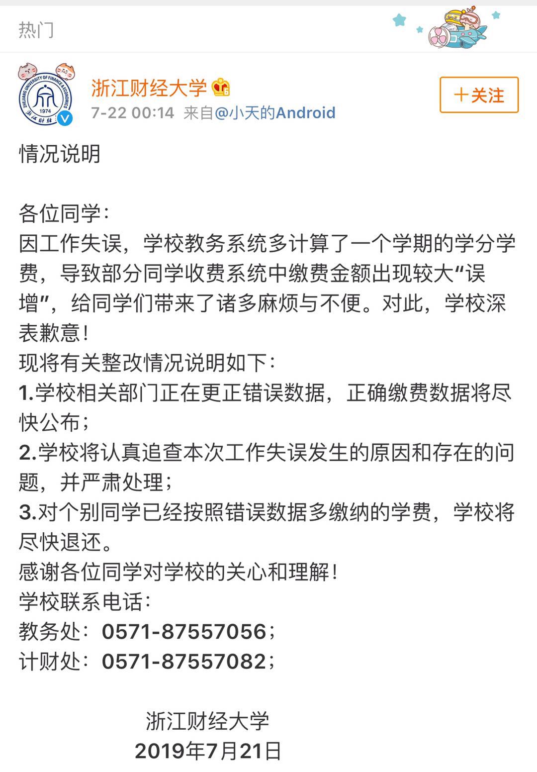 22日,浙江財經(jīng)大學(xué)就此事作出回應(yīng):算錯學(xué)費(fèi)