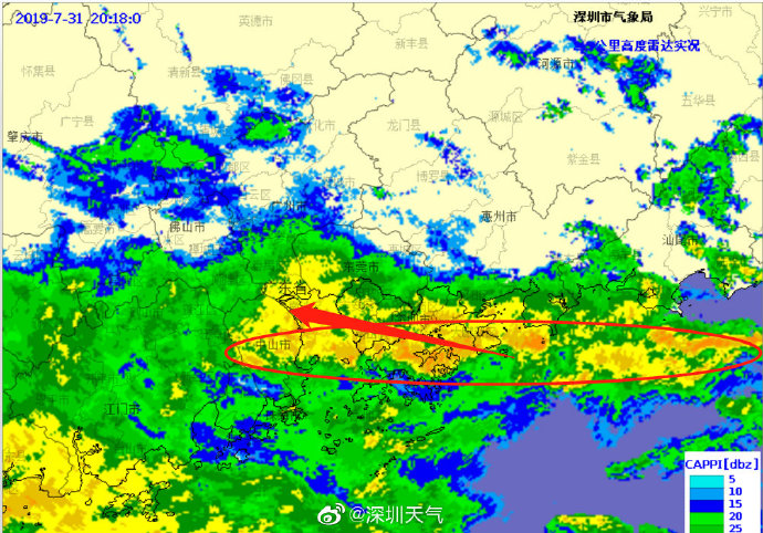 當(dāng)一條雨帶的長(zhǎng)軸和雨帶的移動(dòng)方向(箭頭)夾角很小時(shí),某個(gè)地方就會(huì)被這條雨帶幾乎從頭到尾地經(jīng)過,于是這個(gè)地方的累計(jì)雨量就會(huì)特別大。而現(xiàn)在深圳靠南的大部分區(qū)域就在經(jīng)歷一場(chǎng)列車效應(yīng),所以這場(chǎng)雨持續(xù)時(shí)間比較長(zhǎng),短時(shí)間內(nèi)停不下來。
