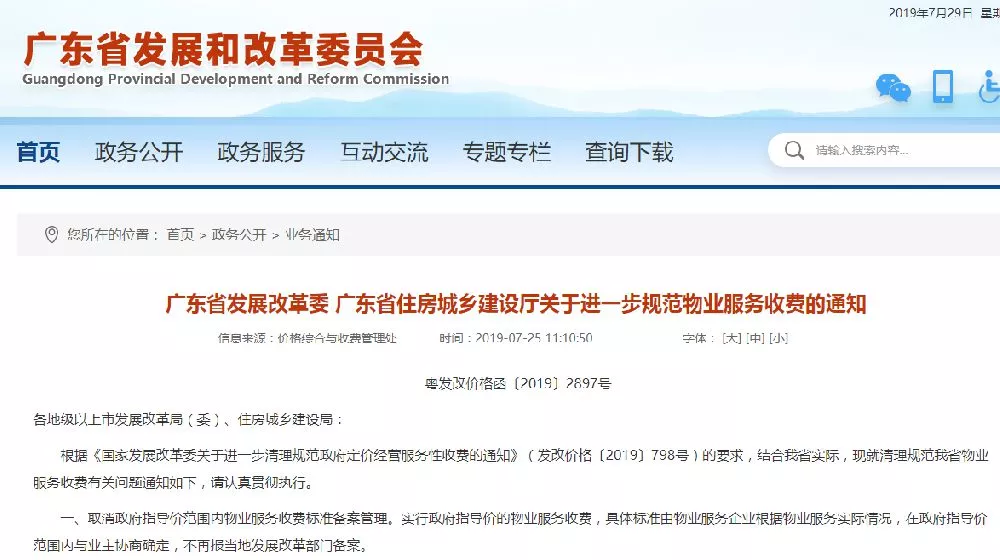 廣東省物業(yè)服務(wù)收費規(guī)范新規(guī)定自2019年8月1日起執(zhí)行。實行政府指導(dǎo)價的物業(yè)服務(wù)收費,具體標(biāo)準(zhǔn)由物業(yè)服務(wù)企業(yè)根據(jù)物業(yè)服務(wù)實際情況,在政府指導(dǎo)價范圍內(nèi)與業(yè)主協(xié)商確定,不再報當(dāng)?shù)匕l(fā)展改革部門備案。