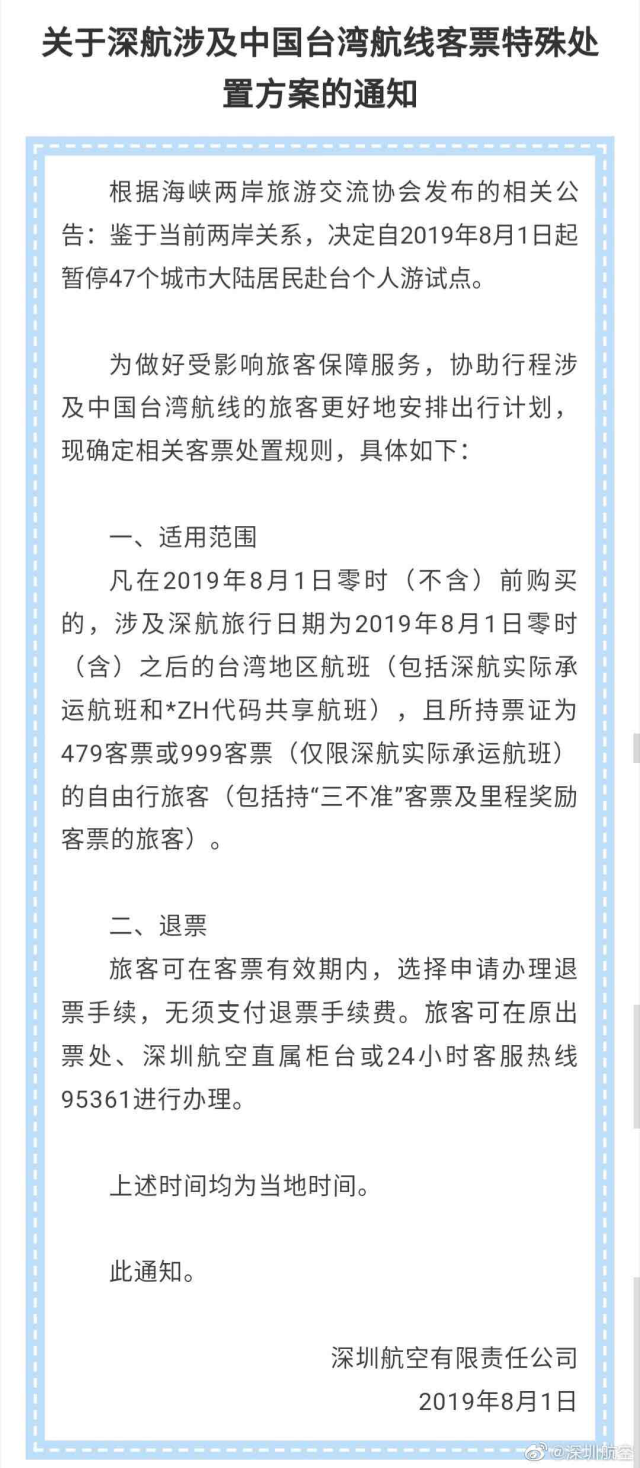 深圳航空剛剛率先發(fā)布了關于深航涉及中國臺灣航線客票特殊處置方案的通知,凡在2019年8月1日零時(不含)前購買的,涉及深航旅行日期為2019年8月1日零時(含)之后的臺灣地區(qū)航班(包括深航實際承運航班和*ZH代碼共享航班),且所持票證為479客票或999客票(僅限深航實際承運航班)的自由行旅客(包括持“三不準”客票及里程獎勵客票的旅客),旅客可在客票有效期內(nèi),選擇申請辦理退票手續(xù),無須支付退票手續(xù)費。旅客可在原出票處、深圳航空直屬柜臺或24小時客服熱線95361進行辦理。