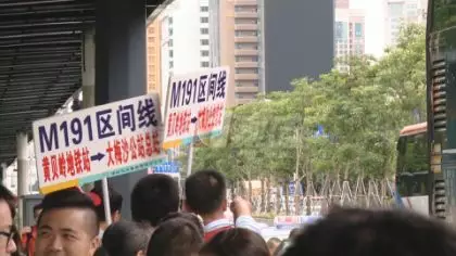 今天周六,準備去往東部大小梅沙等景區(qū)的游客,擠滿了黃貝嶺公交站的站臺,巴士集團的工作人員,也是手舉線路標識牌,在站臺維持秩序。