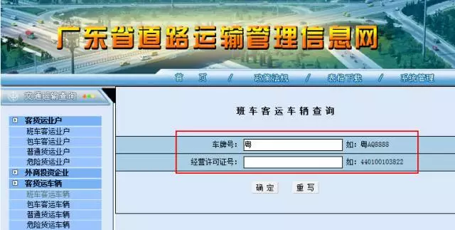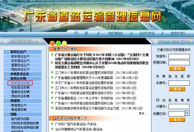 登錄廣東省道路運輸管理信息網(wǎng),點擊左側菜單欄中的「客貨運車輛」,再點擊「客班車客運車輛」,就能進入到查詢頁面。
