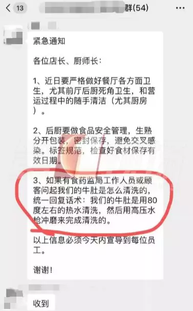 這張聊天截圖顯示:前晚7點54分,八合里的一個內(nèi)部群,發(fā)出了一則緊急通知,要求店長、廚師長近期要做好餐廳各方面衛(wèi)生,后廚要做好食品安全管理。如果有食藥監(jiān)局工作人員或顧客詢問,牛肚是怎么清洗的,統(tǒng)一回復(fù)的話術(shù)是:我們的牛肚是用80度左右的熱水清洗,然后用高壓水槍沖磨來完成清洗的。