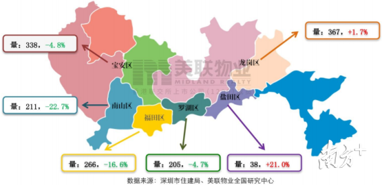 在成交格局方面,龍崗區(qū)與寶安區(qū)盡管成交量彼長(zhǎng)此消,但是兩區(qū)成交量仍然保持前兩名的格局。
