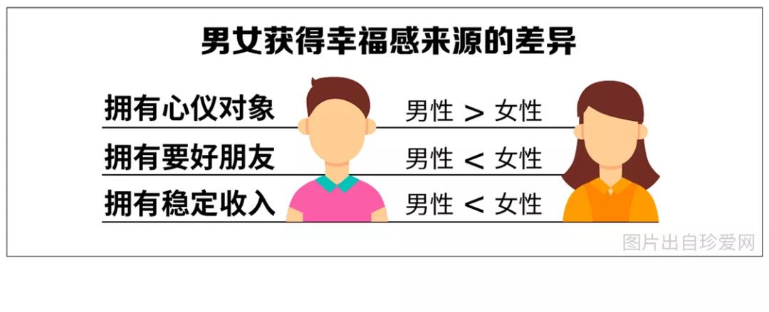 深入研究發(fā)現(xiàn),男性對(duì)“擁有心儀對(duì)象”的需求比例(6.67%)略高于女性(3.17%),女性則是在擁有要好朋友的比例(28.79%)上高于男性(6.67%),且因?yàn)榉€(wěn)定收入感到幸福的女性比例(60%)比男性(53%)更高??梢?,女性更容易從穩(wěn)定的收入中獲得幸福感。