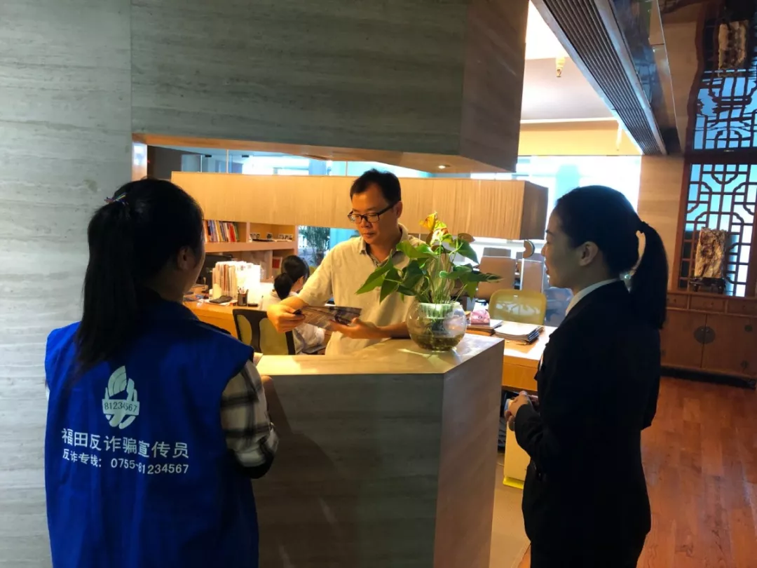 上午10時,深圳市公安局福田分局派出“藍馬甲”宣傳隊走入大中華國際交易廣場,逐層逐戶向企業(yè)員工們派發(fā)反詐騙宣傳單及《福田反詐騙教育???。“藍馬甲”宣傳隊員走進各企業(yè)辦公室,向企業(yè)員工派發(fā)相關(guān)資料,講解反詐騙知識。各企業(yè)員工積極參與,與“藍馬甲”講師頻頻互動,并認真學(xué)習(xí)反詐騙技巧,努力提升自身反詐騙能力。