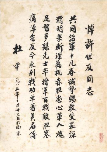 在采訪一位又一位身經(jīng)百戰(zhàn)的幸存者時(shí),吳東峰與他們的筆墨緣也就此結(jié)下?!?985年許世友將軍因病逝世,杜平將軍親手書寫‘悼許世友同志’詩(shī)一首,請(qǐng)我送《人民日?qǐng)?bào)》刊登,我把詩(shī)傳真過(guò)去,原件保存下來(lái)了。這首詩(shī)見證了杜平與許世友的深厚友情,是我最早的將軍墨跡手藏。那之后,我開始有意識(shí)地收集將軍們的筆墨?!?/p>