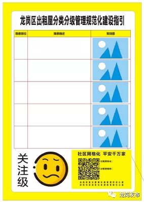 出租屋將分為寬管級(綠標(biāo))、關(guān)注級(黃標(biāo))、嚴(yán)管級(橙標(biāo))、禁止級(紅標(biāo))四個級別。結(jié)合房屋二維碼對四個級別實(shí)行動態(tài)標(biāo)色管理,以房屋二維碼的底色來標(biāo)注。