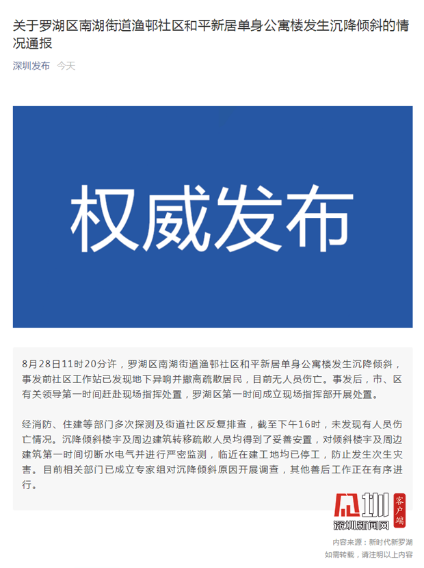 見圳客戶端.深圳新聞網(wǎng)2019年8月28日訊(見圳客戶端、深圳新聞網(wǎng)記者 張玲)8月28日11時20分許,羅湖區(qū)南湖街道漁邨社區(qū)和平新居單身公寓樓發(fā)生沉降傾斜,事發(fā)前社區(qū)工作站已發(fā)現(xiàn)地下異響并撤離疏散居民,目前無人員傷亡。目前相關(guān)部門已成立專家組對沉降傾斜原因開展調(diào)查,其他善后工作正在有序進行。臨時疏散人員被安置到濱河小學(xué)、羅湖小學(xué)、羅湖中學(xué)高級初中部。