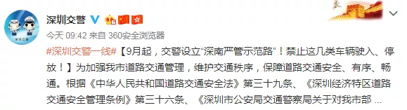 9月起,交警設(shè)立“深南嚴管示范路”!禁止這幾類車輛駛?cè)?、停放?/p>