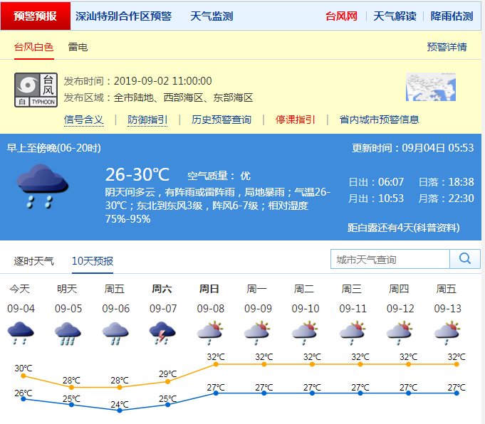 見圳客戶端.深圳新聞網2019年9月4日訊 據深圳市氣象臺消息,臺風“劍魚”3日17時減弱為熱帶低壓,目前其風力進一步減弱,已很難確定其環(huán)流中心,中央臺4日02時對其停止編號。預計本周深圳多降雨,深圳(含深汕)4-5日有雷陣雨,局部暴雨,沿海和海區(qū)最大陣風6-7級。