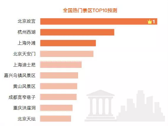 根據交通運輸部科學研究院報告顯示,國慶全國熱門景區(qū)TOP10北京故宮、杭州西湖、上海外灘位列前三位,另外還有北京天安門、上海迪士尼、嘉興烏鎮(zhèn)風景區(qū)、黃山風景區(qū)、成都寬窄巷子、重慶洪崖洞、北京天壇位列其中。