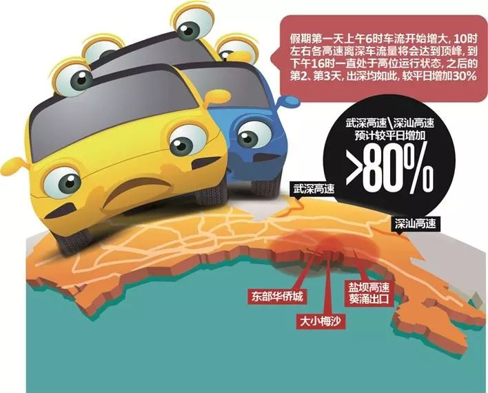 ⑩深圳交警預(yù)測(cè)全市從9月30日下午開始交通流量加大,9月30日、10月1日出行量達(dá)到頂峰。各高速公路、市內(nèi)各景點(diǎn)、商圈、購(gòu)物點(diǎn)以及東部景區(qū)會(huì)出現(xiàn)不同程度的擁堵,全市各區(qū)羅湖區(qū)最為擁堵,其次是福田區(qū)、南山區(qū)。預(yù)計(jì)‘國(guó)慶’期間,全市出深和入深車輛總數(shù)均將超過(guò)170萬(wàn)輛。