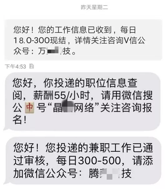 內(nèi)容更是大同小異,都是要求應(yīng)聘者添加某個(gè)QQ號(hào)或者關(guān)注某個(gè)微信公眾號(hào)。