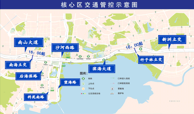 以深圳灣人才公園為中心,濱海大道(南海立交至竹子林立交段雙方向)、沙河西路(濱海大道至東濱立交雙方向)、望海路(東濱立交至中心段雙方向)、中心路(科苑南路至望海路雙方向)、科苑南路(東濱路至中心路段東側)、東濱路(后海濱路至科苑南路段,不含)、后海濱路(濱海大道至東濱路,不含)的合圍區(qū)域實施交通管制;以及濱海大道東往西方向(竹子林立交至南海立交),西往東方向(南海立交至竹子林立交)實施交通管制。