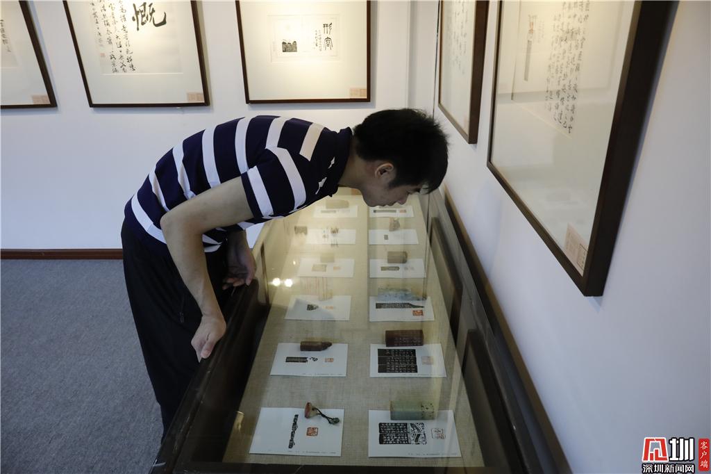 一位參觀者正在欣賞篆刻作品。