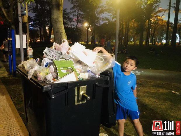 10月1日晚上8:50分,深圳灣公園里,剛剛看完焰火晚會的孩子正將垃圾丟進垃圾桶。