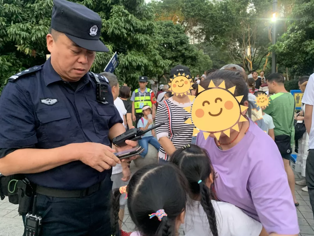 10月2日,深圳市公安局福田公安分局機動訓(xùn)練大隊五中隊民警麥炳耀在燈光秀安保執(zhí)勤中,發(fā)現(xiàn)一位走失小孩的母親心急如焚在哭泣,麥炳耀邊安慰她邊向李曉峰副大隊長、黃鎮(zhèn)雄副大隊長報告情況,隨后大隊領(lǐng)導(dǎo)立即通過對講機向現(xiàn)場執(zhí)勤民警和隊員通報尋人啟事及人物特征,不久后,對講機傳來好消息,在民警麥炳耀帶領(lǐng)輔警張世鵬尋尋找下,終于在東廣場東北出入口處找到走失的兩個小孩并迅速通知小孩母親前來帶回。