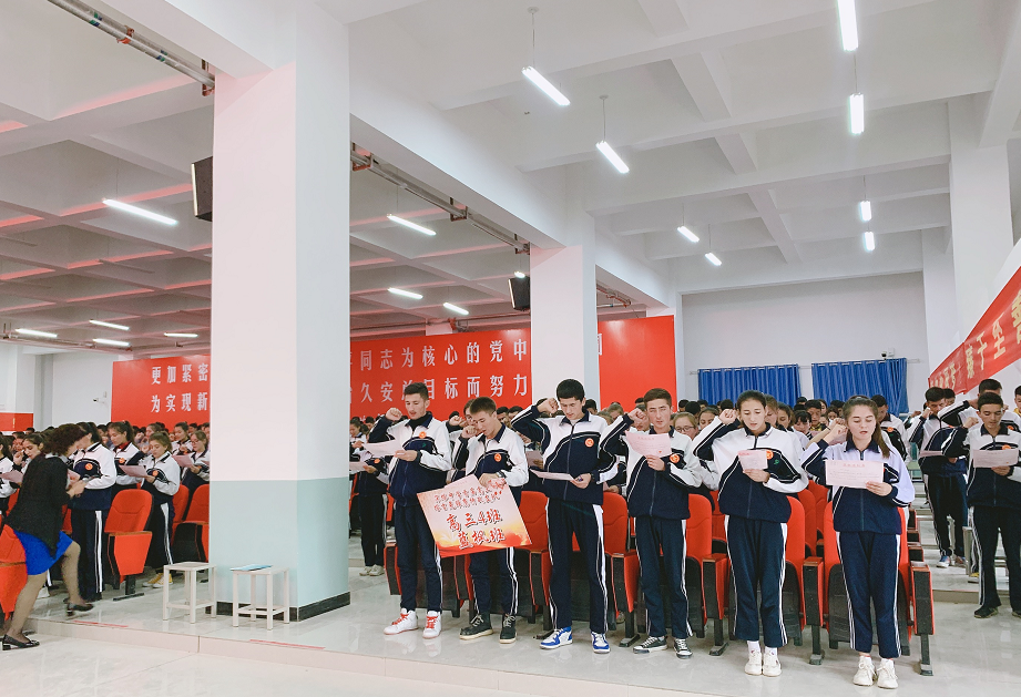 會場上,紅旗飄揚(yáng),氣氛熱烈。出征儀式在雄壯的國歌聲中拉開了序幕。佩戴著訂制的儀式徽章的高三各連將士整齊站立,高聲宣誓,他們用響徹云霄的錚錚誓言表達(dá)了自己堅(jiān)定奮進(jìn)的決心,用泰然自若的神情展現(xiàn)了深塔學(xué)子氣壯山河的豪氣。誓言震耳欲聾,將士信心滿懷。