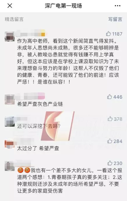 其中一位網(wǎng)友說:作為高中老師,看到這個(gè)新聞簡(jiǎn)直氣得發(fā)抖。未成年人思想尚未成熟,很多還不能夠明辨是非,被人教唆慫恿就覺得有錢賺不用上學(xué)真好,但這本應(yīng)該是在學(xué)校上課汲取知識(shí),為了未來理想奮斗努力的年齡!這幫人不僅毀了他們的健康、青春,還可能毀了他們的前途!應(yīng)該嚴(yán)懲,是誰在縱容!