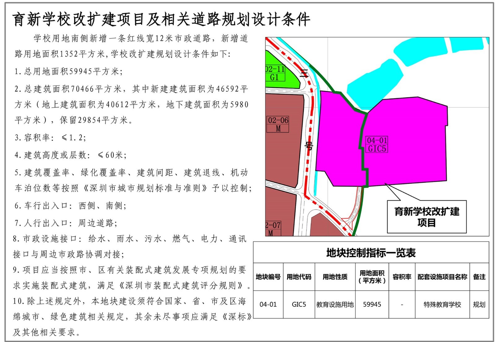 深圳市育新學(xué)校位于光明街道碧眼社區(qū),規(guī)劃觀光路(現(xiàn)狀已建)和二十三號路(現(xiàn)狀已建)交叉口西北側(cè)。為消除校園消防、交通出行安全隱患,滿足規(guī)范需求,新增學(xué)校用地1550平方米,以解決消防、交通需求,并結(jié)合周邊道路線形優(yōu)化西側(cè)邊界,學(xué)??傆玫孛娣e由58395平方米調(diào)整為59945平方米,學(xué)校用地南側(cè)新增一條紅線寬12米市政道路,道路用地面積1352平方米。