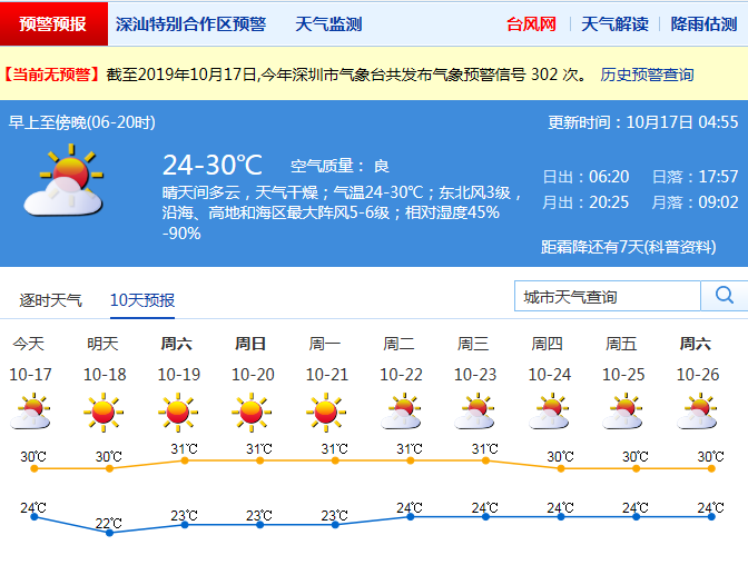 見(jiàn)圳客戶(hù)端·深圳新聞網(wǎng)2019年10月17日訊 15日夜間到16日白天,我市晴天間多云,有分散陣雨,最大雨量出現(xiàn)在龍城街道愛(ài)聯(lián)站5.4毫米;早晨最低氣溫22-24℃;東風(fēng)2-3級(jí),沿海和高地陣風(fēng)6-7級(jí);相對(duì)濕度40%-90%。
