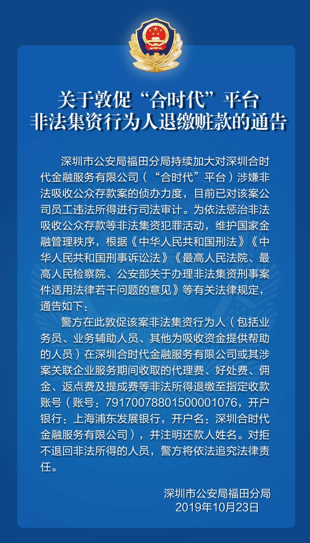 關(guān)于敦促“合時代”平臺非法集資行為人退繳贓款的通告