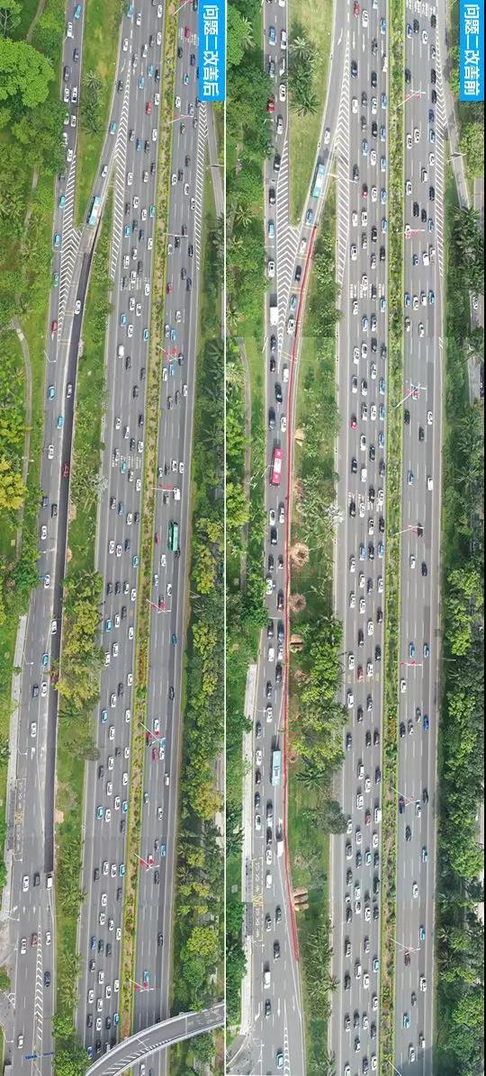 這一次改造歷時(shí)4個(gè)月,目前通行數(shù)據(jù)顯示,該路段總體運(yùn)行效率較改善前提升12%,高峰期路段平均車速由改善前的22.4km/h提高到40.4km/h。