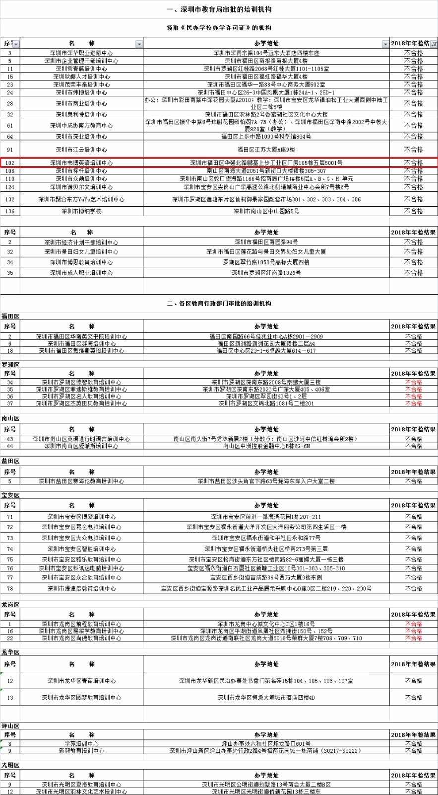 10月25日,深圳市教育局在其官網(wǎng)發(fā)布了《深圳市教育培訓(xùn)機(jī)構(gòu)年審信息公告》,為市民選擇培訓(xùn)機(jī)構(gòu)提供參考。晶報APP梳理后發(fā)現(xiàn),48家培訓(xùn)機(jī)構(gòu)2018年年檢結(jié)果被評定為不合格。