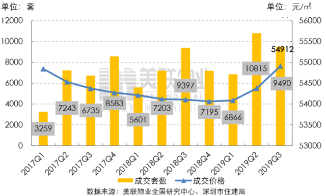深圳市2017年以來一手住宅季度成交量?jī)r(jià)走勢(shì)圖