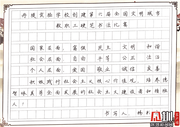 見圳客戶端·深圳新聞網(wǎng)10月29日訊(見圳客戶端、深圳新聞網(wǎng)記者 潘寶儀 通訊員 袁小俊 圖/朱雅琪 ) 為落實(shí)立德樹人總目標(biāo)、培育和踐行社會(huì)主義核心價(jià)值觀,創(chuàng)建文明城市,積極倡導(dǎo)全校教職工勤練教學(xué)基本功,提高教師綜合素養(yǎng),豐富課余生活,展示丹堤實(shí)驗(yàn)學(xué)校教職工風(fēng)采,學(xué)校于10月25日舉行了“創(chuàng)建第六屆全國(guó)文明城市教職工硬筆書法比賽”。