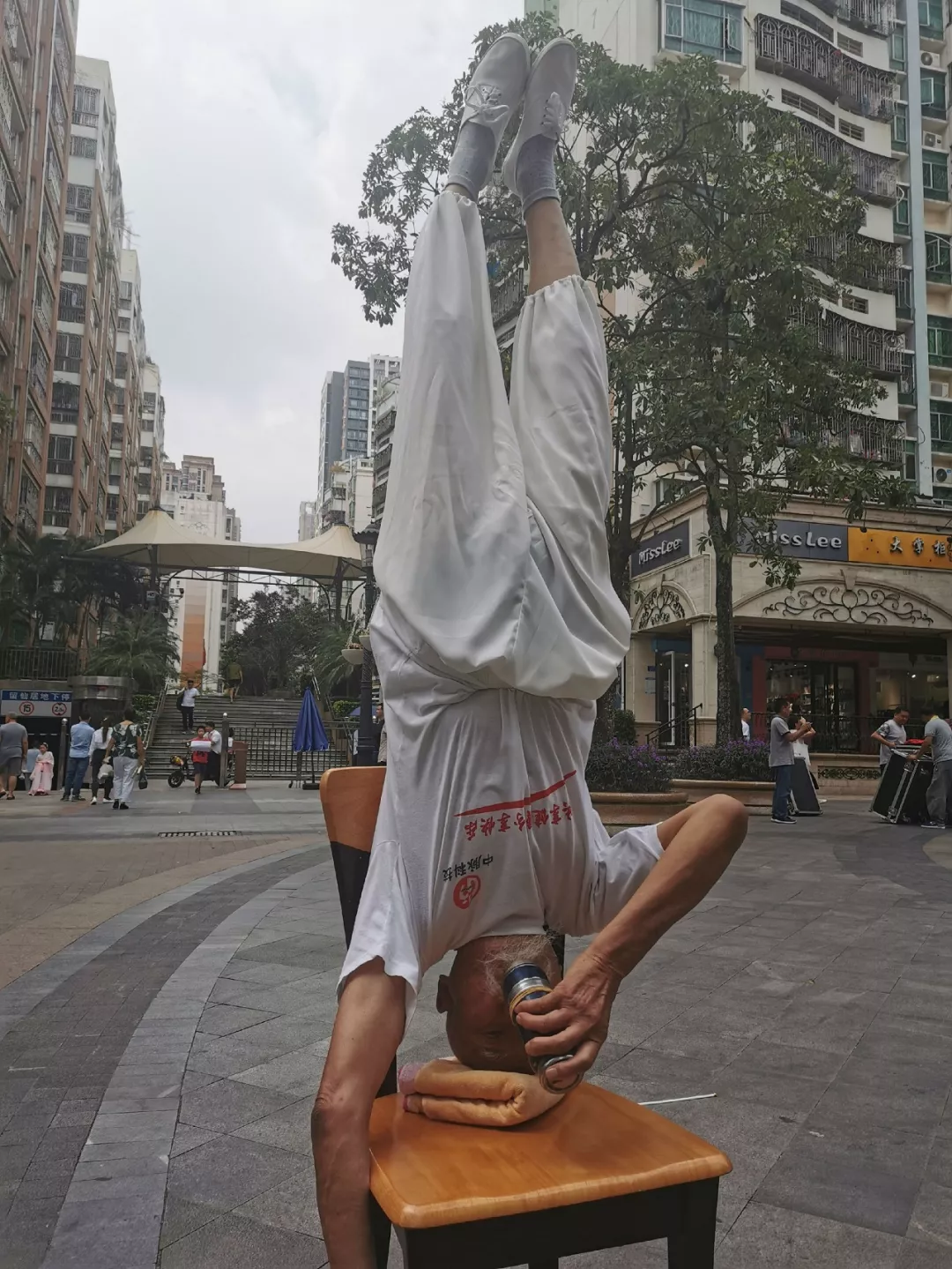 采訪當(dāng)日,記者正在調(diào)試相機(jī)的時候,忽聞?wù)坡曀钠?,原來魏宗信又在廣場上秀出拿手絕活“倒立”: