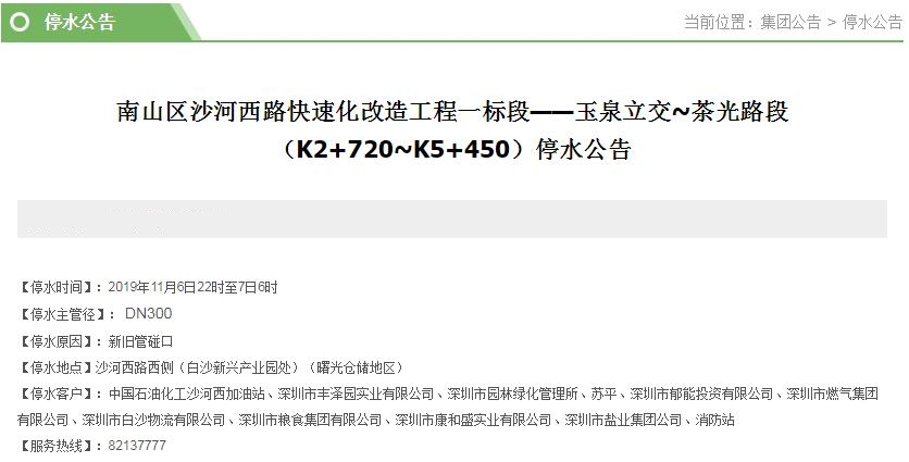 停水客戶中國石油化工沙河西加油站、深圳市豐澤園實業(yè)有限公司、深圳市園林綠化管理所、蘇平、深圳市郁能投資有限公司、深圳市燃氣集團有限公司、深圳市白沙物流有限公司、深圳市糧食集團有限公司、深圳市康和盛實業(yè)有限公司、深圳市鹽業(yè)集團公司、消防站