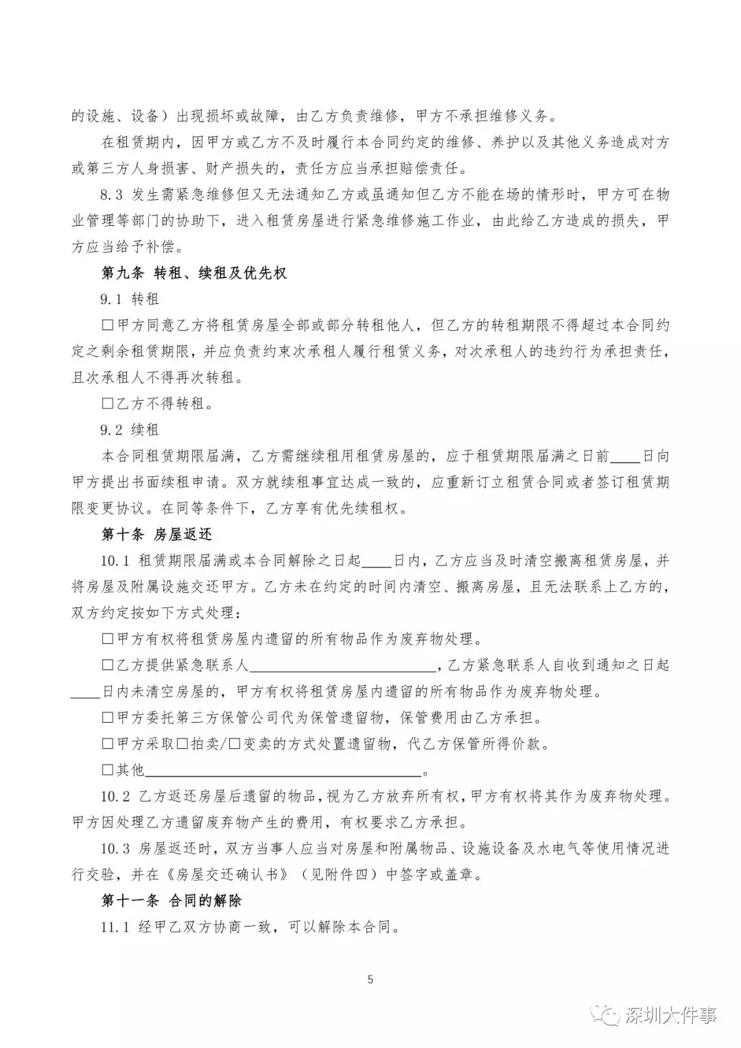 7、強(qiáng)化落實(shí)房屋安全主體責(zé)任,新版合同保留了舊版合同附件《深圳市房屋租賃安全管理責(zé)任書》,要求租賃雙方當(dāng)事人必須簽訂該責(zé)任書,否則房屋租賃主管部門不受理合同登記備案。