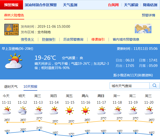 見圳客戶端·深圳新聞網(wǎng)2019年11月11日訊 最近鵬城天氣,終于有了一絲絲涼意,有點(diǎn)秋高氣爽的感覺了。剛剛過去的周末,全市晴天間多云,氣溫18℃-27℃。全市森林火險(xiǎn)橙色預(yù)警信號(hào)生效中。