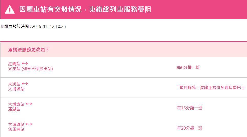 據港鐵官網目前最新消息,東鐵線列車運營服務調整為:紅磡站至火炭站每6分鐘一班;火炭站至大埔墟站暫停服務;大埔墟站至羅湖站每15分鐘一班;大埔墟站至落馬洲站每20分種一班。港鐵其他線路也有多處調整。
