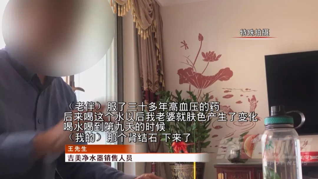 執(zhí)法人員來(lái)到客廳,盡管王先生的兒子矢口否認(rèn)家里在賣凈水器,但桌子上擺放著宣傳單頁(yè),王先生正在推銷凈水器,一切都說(shuō)明了問(wèn)題。隨后王先生帶執(zhí)法人員來(lái)到廚房,繼續(xù)展示凈水器的療效。王先生的老伴兒說(shuō),除了他們自家喝磁化水,親戚們也都在他的推薦下使用這款凈水器。