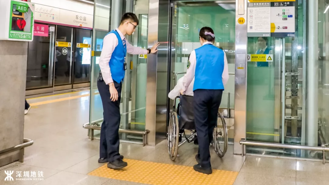 幫忙按住直梯按鈕扶住輪椅
