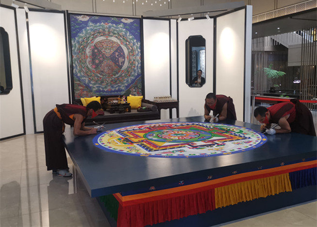 在活動現(xiàn)場,壇城沙畫的現(xiàn)場制作格外引人注目。“一沙一世界,一葉一菩提”——壇城沙畫的過程仿佛一場視覺的盛宴。據了解,壇城是指對一座宮殿一個世界的泛義,用珍貴珊瑚、瑪瑙、綠松石等礦物質研磨成粉,落沙即成畫,畫面立體生動,壇城展示了高度的藝術魅力和視覺觀感。