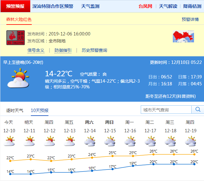 見圳客戶端·深圳新聞網2019年12月10日訊 今日深圳晴天間多云,空氣干燥;氣溫14-22℃;偏北風2-3級;相對濕度25%-70%。
