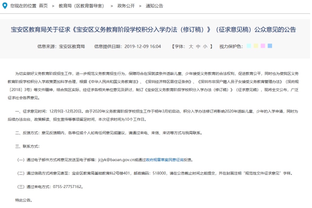 記者剛剛從寶安區(qū)教育局獲悉,12月9日,寶安區(qū)教育局發(fā)布關(guān)于征求《寶安區(qū)義務教育階段學校積分入學辦法(修訂稿)》(征求意見稿)的公告,就寶安區(qū)義務教育階段學校積分入學辦法修訂進行征求意見。