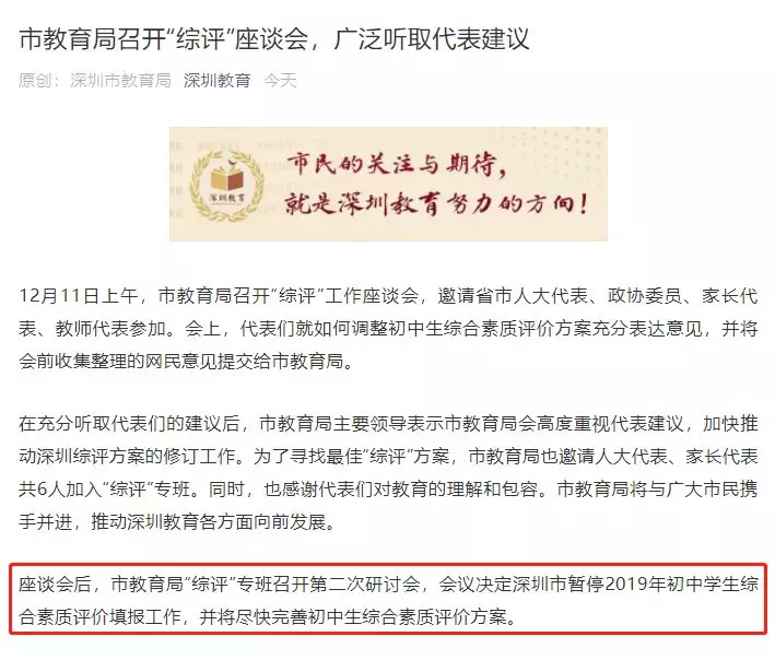 座談會后,市教育局“綜評”專班召開第二次研討會,會議決定深圳市暫停2019年初中學(xué)生綜合素質(zhì)評價填報工作,并將盡快完善初中生綜合素質(zhì)評價方案。