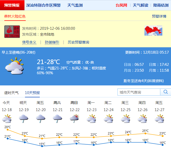 見圳客戶端·深圳新聞網(wǎng)2019年12月18日訊 深圳市氣象局預(yù)計(jì)18日多云,午間天氣溫暖,早晚有輕霧,氣溫21-28℃;19-22日受冷空氣影響,轉(zhuǎn)陰天,部分時(shí)間有分散小雨,氣溫下降,天氣轉(zhuǎn)涼,其中19日沿海、高地陣風(fēng)5-6級(jí);23日多云,可見陽(yáng)光。森林火險(xiǎn)紅色預(yù)警信號(hào)持續(xù)生效中,請(qǐng)注意森林防火。