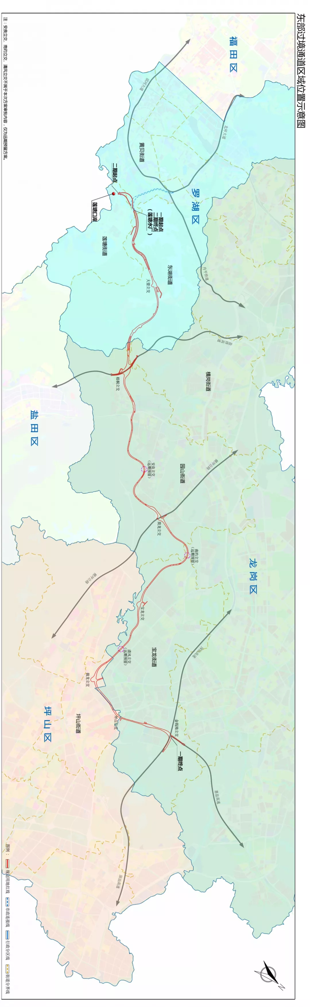 深圳市東部過境通道擬選址于羅湖區(qū)蓮塘街道、黃貝街道和東湖街道,龍崗區(qū)橫崗街道、園山街道和寶龍街道,坪山區(qū)坪山街道區(qū)域內(nèi)。