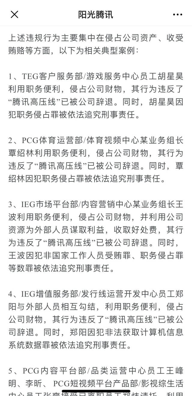 2、PCG體育運營部/體育視頻中心某業(yè)務組長覃紹林利用職務便利,侵占公司財物,其行為違反了“騰訊高壓線”已被公司辭退。同時,覃紹林因犯職務侵占罪被依法追究刑事責任。