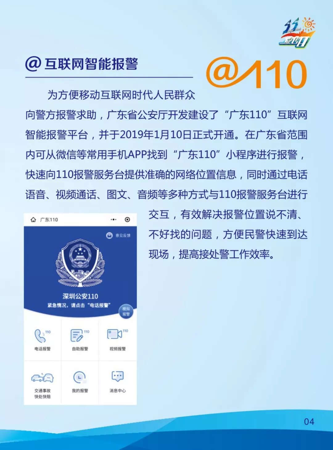 “廣東110”除了報(bào)警功能,還將上線新功能!“110宣傳日”當(dāng)天,“廣東110”報(bào)警小程序的交通事故快處快賠功能上線。還可了解到深圳交警星級(jí)用戶輕微事故遠(yuǎn)程處理系統(tǒng)相關(guān)資訊,現(xiàn)場(chǎng)教您輕松掌握交通事故快處快賠辦法。