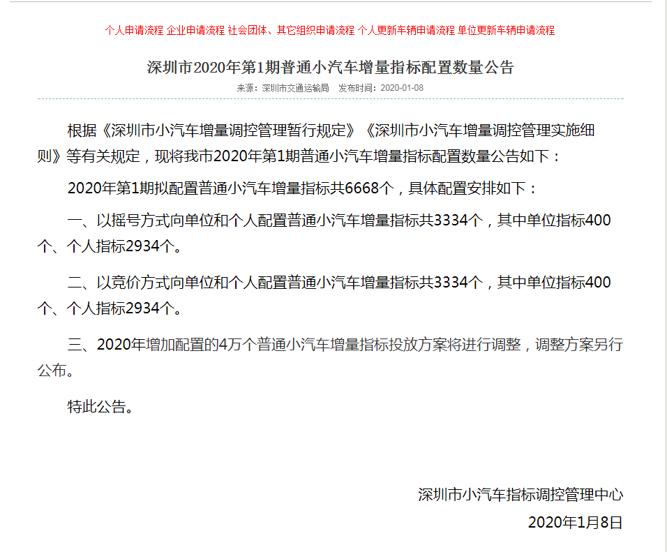 2020年深圳首期小汽車(chē)搖號(hào)競(jìng)價(jià)推遲一周,順延至節(jié)后第一個(gè)工作日1月31日。