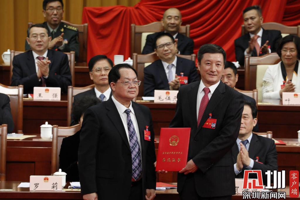 深圳市人大常委會(huì)主任駱文智(左)為新當(dāng)選的市人大常委會(huì)委員何銳軍(右)頒發(fā)當(dāng)選證書。