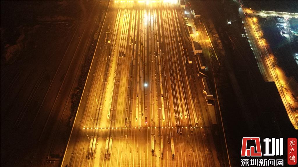 1月15日凌晨,深圳動(dòng)車(chē)運(yùn)用所內(nèi)的存車(chē)庫(kù)航拍畫(huà)面。